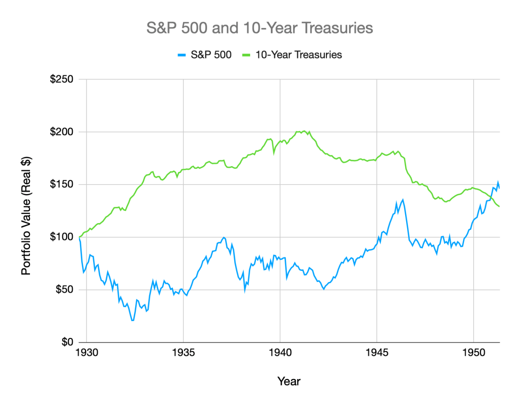 Certainly, a liability 30 years from now should be covered by equities right? Maybe, but I was frightened by charts like this of 10-year Treasuries outperforming stocks over a 27-year timeframe: